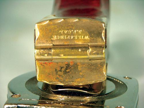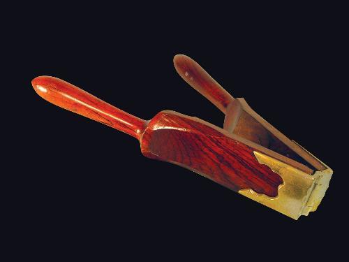 Will and Finck Lemon Squeezer, plated brass made by the famous Will and Finck Company of San Francisco, CA. Cherry wood and nickel. Excellent Condition. 10 1/2 inches closed.