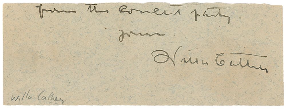 Ink signature, “from the concert party. Yours, Willa Cather,” on an off-white 5 x 2 slip clipped from the closing of a letter. Central vertical fold, a bit of light toning, pencil notation to bottom, and mounting remnants to reverse, otherwise fine condition.