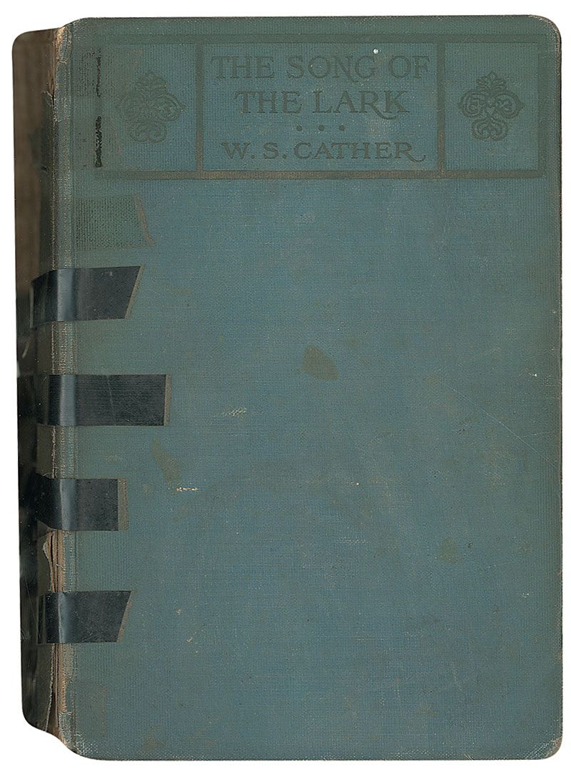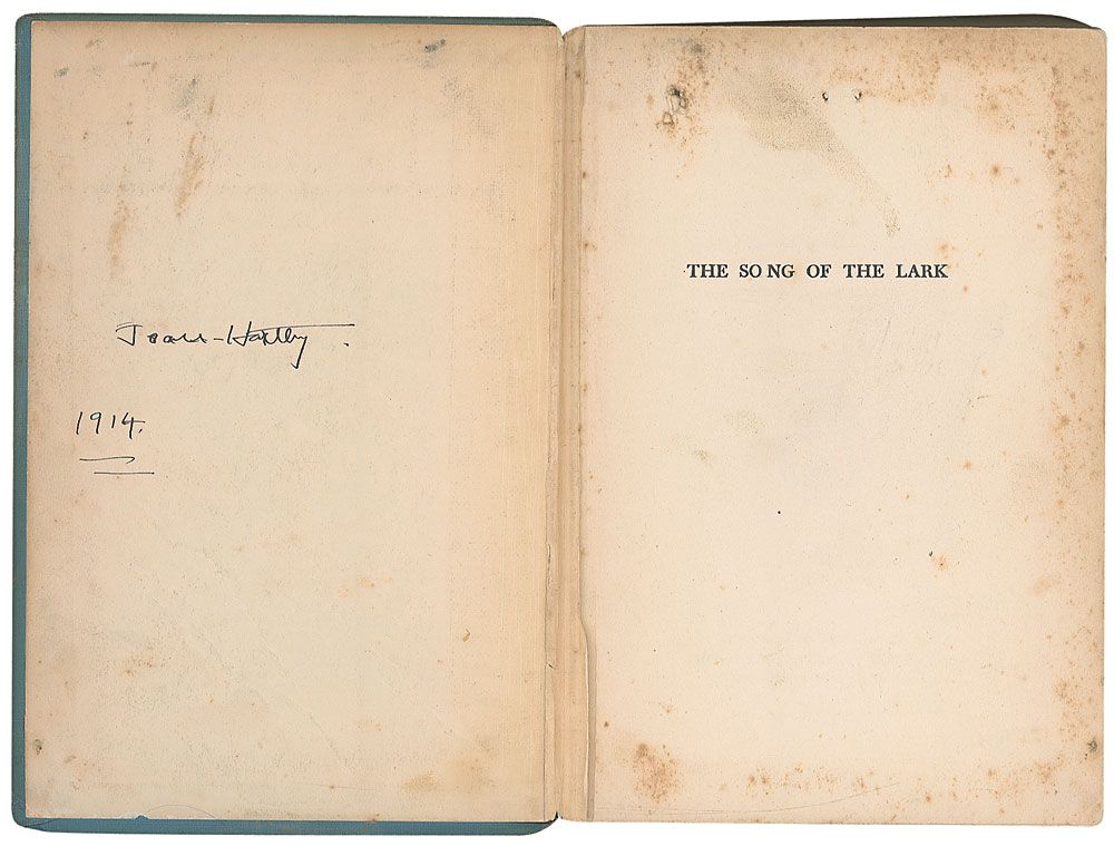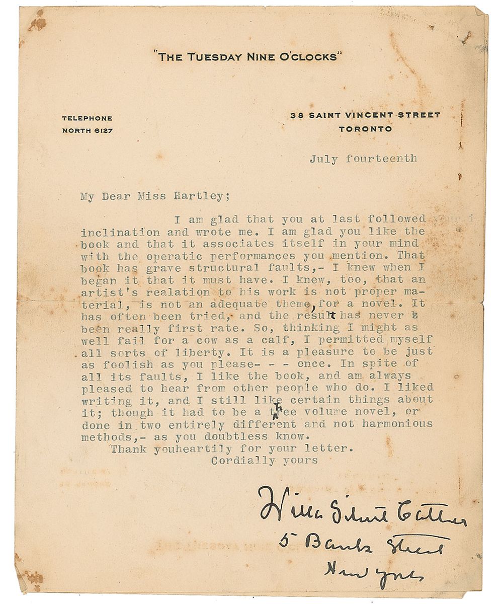 TLS signed with her uncommon full name, “Willa Sibert Cather,” one page, 6.5 x 8, The Tuesday Nine O’Clocks letterhead, July 14. Letter to Joan Hartley, in full: “I am glad that you at last followed inclination and wrote me. I am glad you like the book and that it associates itself in your mind with the operatic performances you mention. That book has grave structural faults, — I knew when I began it that it must have. I knew, too, that an artist’s relation to his work is not proper material, is not an adequate theme, for a novel. It has often been tried, and the result has never been really first rate. So, thinking I might as well fail for a cow as a calf, I permitted myself all sorts of liberty. It is a pleasure to be just as foolish as you please—once. In spite of all its faults, I like the book, and am always pleased to hear from other people who do. I liked writing it, and I still like certain things about it; though it had to be a three volume novel, or done in two entirely different and not harmonious methods,—as you doubtless know. Thank you heartily for your letter.” Under her uncommon full signature, Cather adds her mailing address. Reinforcement to reverse of central horizontal fold, scattered soiling and foxing, a couple staple holes, and light dampstaining, otherwise very good condition. Accompanied by Hartley’s copy of The Song of the Lark, with her name and incorrect date penned on the front pastedown. Book is in fair condition.