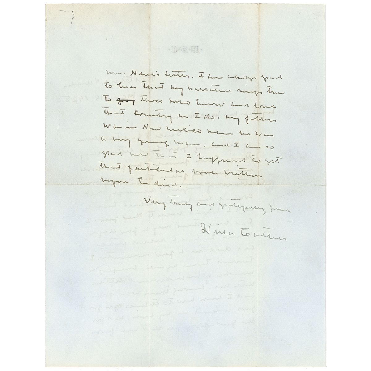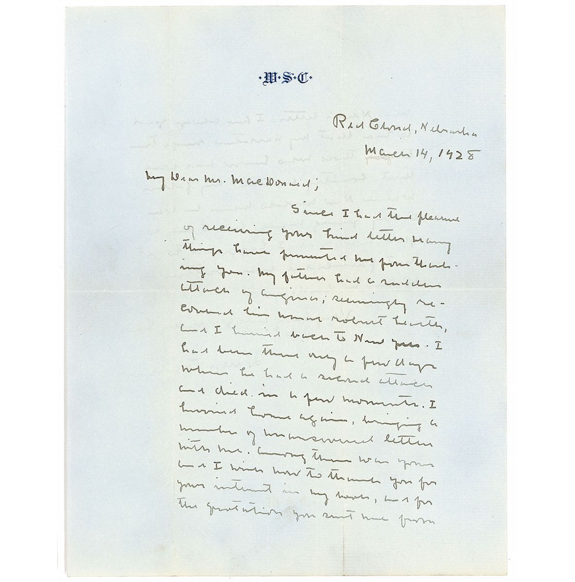 Distinguished Pulitzer Prize–winning American author (1876–1947) of such classics as O Pioneers! and My Antonia. ALS, one page both sides, 8.5 x 11, personal letterhead, March 14, 1928. Letter to Benjamin MacDonald who sent his compliments for Death Comes for the Archbishop. In part: “Since I had the pleasure of receiving your kind letter many things have prevented me from thanking you. My father had a sudden attack of angina…and I hurried to New York. I had been there only a few days when he had a severe attack and died in a few moments. I hurried home again, bringing a number of unanswered letters with me…I am always glad to hear that my narratives ring true to those who know & love that country as I do.” Accompanied by the original mailing envelope, as well as a copy of the letter sent to Cather by MacDonald. In fine condition, with intersecting mailing folds, and some mild edge toning.