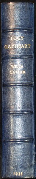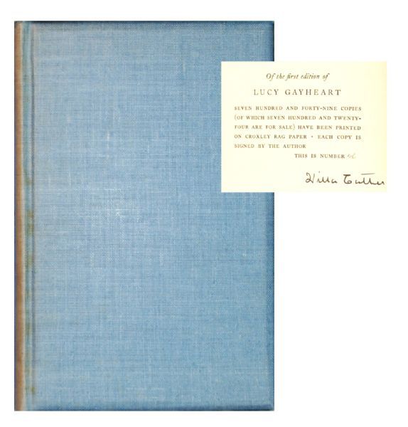 Signed book: Lucy Gayheart. Limited signed first edition of 749 copies (this being No. 46). NY: Alfred A. Knopf, 1935. Hardcover, 6.25 x 9.25, 231 pages. Signed on the colophon in black ink. Autographic condition: Fine. Book condition: VG/None. Blue cloth-covered boards with gilt lettering to spine and gilted upper text block edge; spine sunned; some very light foxing to exterior; slightly yellowed (darker at pastedowns); previous owner’s bookplate on front pastedown. In attractive custom-made case, half-bound in blue leather with gilt titles and marbled edges.