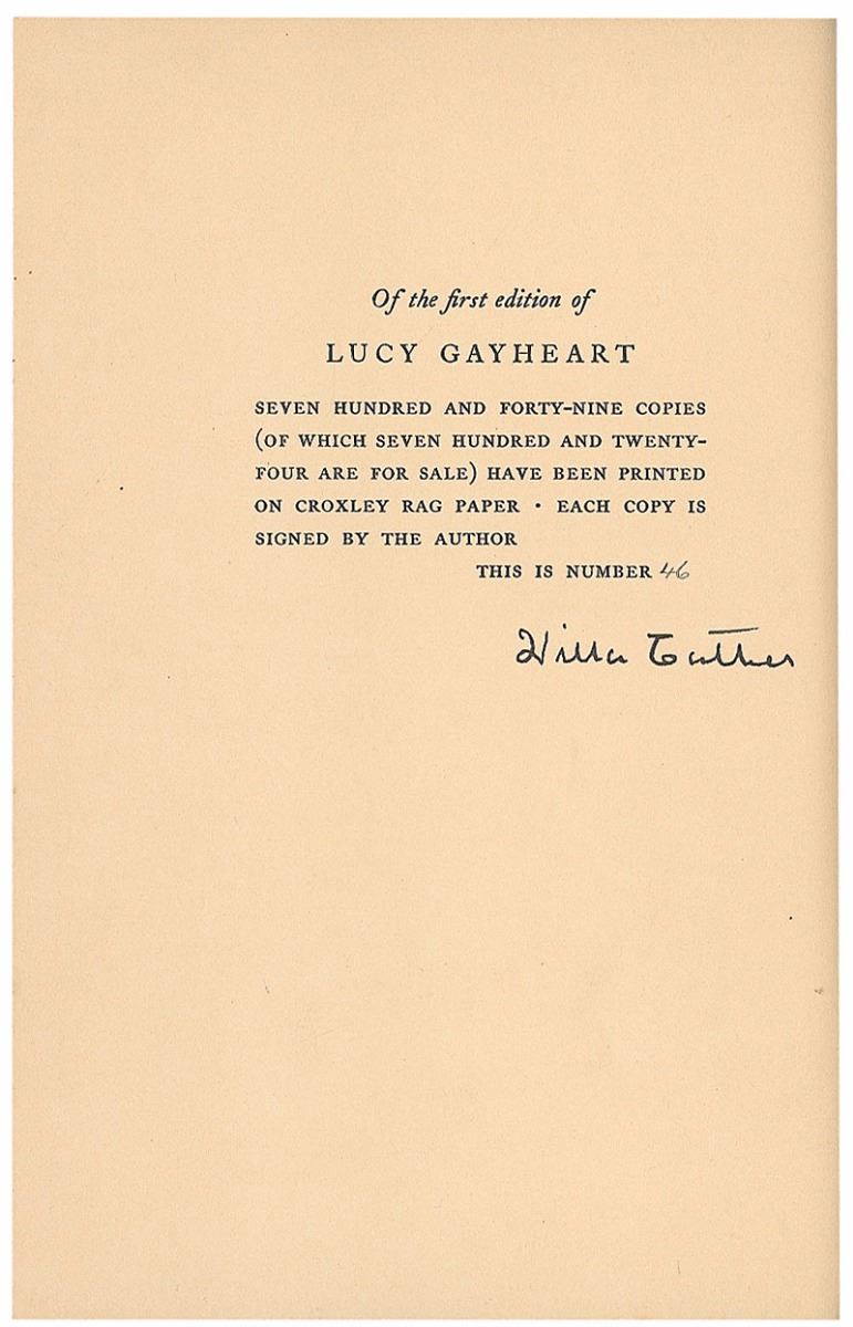 Signed book: Lucy Gayheart. Limited first edition, numbered 46/749. NY: Alfred A. Knopf, 1935. Hardcover, 6.25 x 9.25, 231 pages. Signed on the colophon in black ink. Autographic condition: fine. Book condition: VG/None, in an attractive custom-made case.