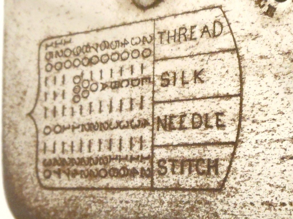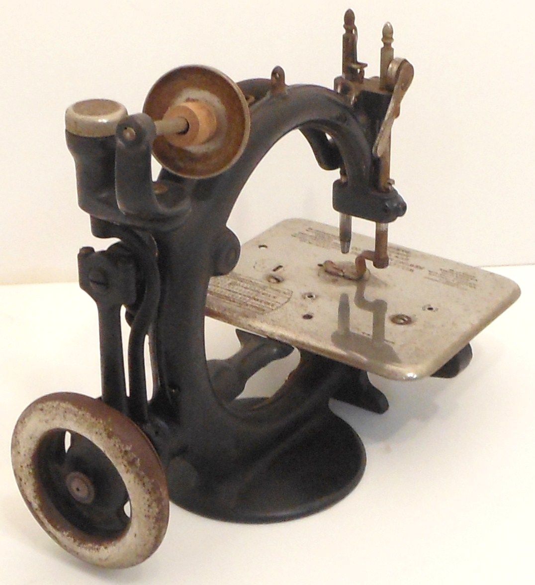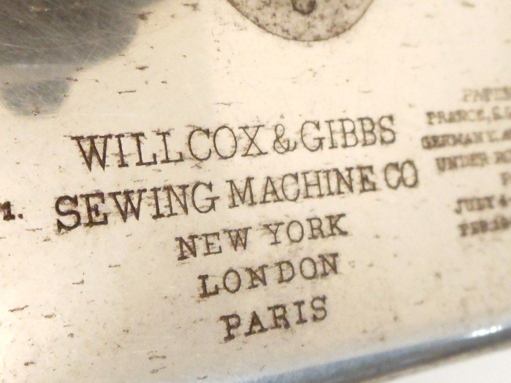 8 1/2" tall x 10 1/2" long x 5 7/8" wide, Antique Willcox & Gibbs Sewing Machine Co., metal, tabletop, treadle style , orphan head, sewing. Patent dates from 1871-1883. Great working condition with surface rust.