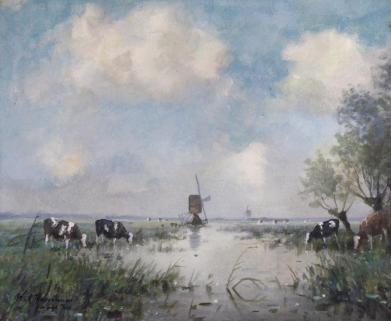 Dutch [1873-1956] CATTLE GRAZING BY A WINDMILL watercolour heightened with white on paper 12.75 x 15.75 in. (32.4 x 40 cm) signed