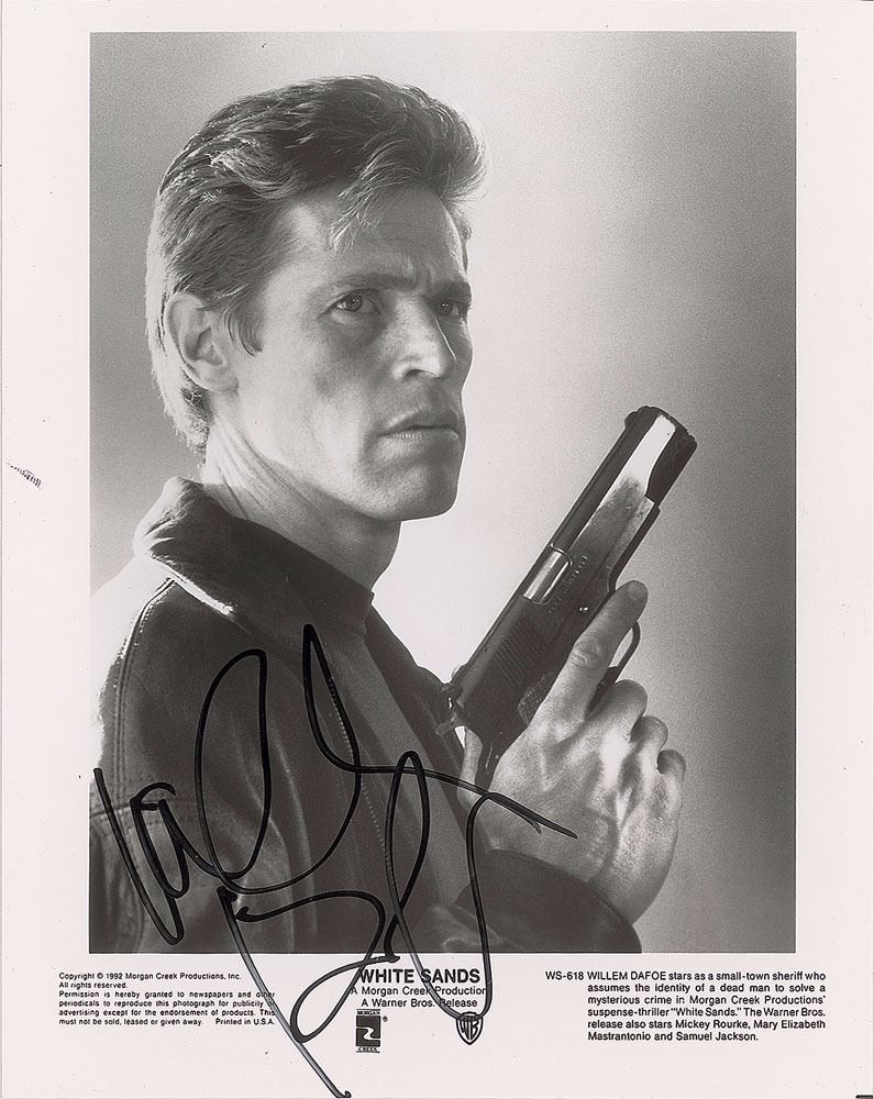 Glossy 8 x 10 Morgan Creek/Warner Bros. publicity photo of Dafoe as Ray Dolezal from the 1992 film White Sands, signed in black felt tip. In fine condition. From the Harvey and Rhoda Kuflik Collection.