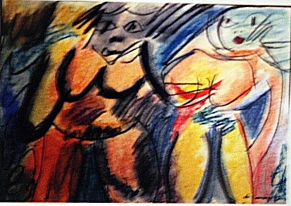 Pastel on paper in the manner of Willem De Kooning "Two Women VII", circa 1945, private collection, unframed dimensions approximately 19x14. Willem de Kooning, (born April 24, 1904, Rotterdam, Netherlands—died March 19, 1997, East Hampton, New York, U.S.) Dutch-born American painter who was one of the leading exponents of Abstract Expressionism, particularly the form known as Action painting. During the 1930s and ’40s de Kooning worked simultaneously in figurative and abstract modes, but by about 1945 these two tendencies seemed to fuse. The series Woman I–VI caused a sensation with its violent imagery and impulsive, energetic technique. His later work showed an increasing preoccupation with landscape.