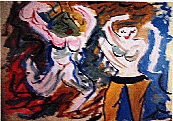 Oil on paper in the manner of Willem De Kooning "Two Women", circa 1990, private collection, unframed dimensions approximately 19x14. Willem de Kooning, (born April 24, 1904, Rotterdam, Netherlands—died March 19, 1997, East Hampton, New York, U.S.) Dutch-born American painter who was one of the leading exponents of Abstract Expressionism, particularly the form known as Action painting. During the 1930s and ’40s de Kooning worked simultaneously in figurative and abstract modes, but by about 1945 these two tendencies seemed to fuse. The series Woman I–VI caused a sensation with its violent imagery and impulsive, energetic technique. His later work showed an increasing preoccupation with landscape.