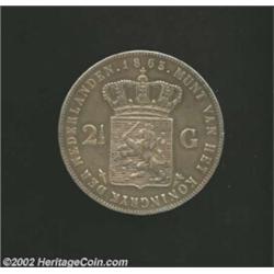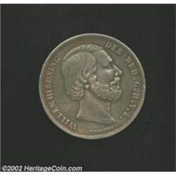 Willem III 2 1/2 Gulden 1863, KM82, Fine-VF, old cleaning. The key issue of this long-lived type. Important notice: We expect to be auctioning lots at the rate of 200-250 per hour. Sometimes eBay Premier live bid software cannot keep up with that pace, so we strongly recommend that you place a realistic proxy bid now as insurance to avoid disappointment. Also please note that all Heritage/CAA lots purchased through eBay Premier carry a 20% Buyer's Premium. Please make sure you read the Terms and Conditions.