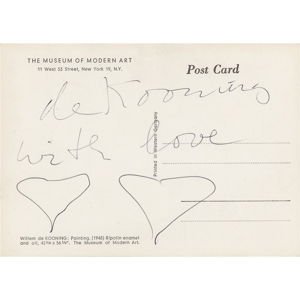 Glossy 5.75 x 4 postcard from New York's Museum of Modern Art depicting a 1948 painting by Willem de Kooning, signed on the reverse in black ballpoint, "de Kooning, with love," who adds two heart sketches. In fine condition.