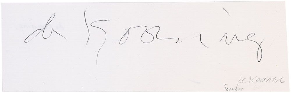 Dutch-born American painter (1904–1997) who was one of the seminal figures of the Abstract Expressionist movement. Ballpoint signature, “de Kooning,” on an off-white 7 x 2.25 slip, with a pencil notation along bottom edge. In fine condition.