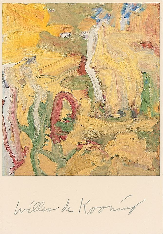 Color 4 x 6 postcard of de Kooning's 1976 work 'Untitled X,' signed in the lower border in black ballpoint, "Willem de Kooning." Includes a felt tip signature of his wife, "Elaine de Kooning," on an off-white slip. In very fine condition.