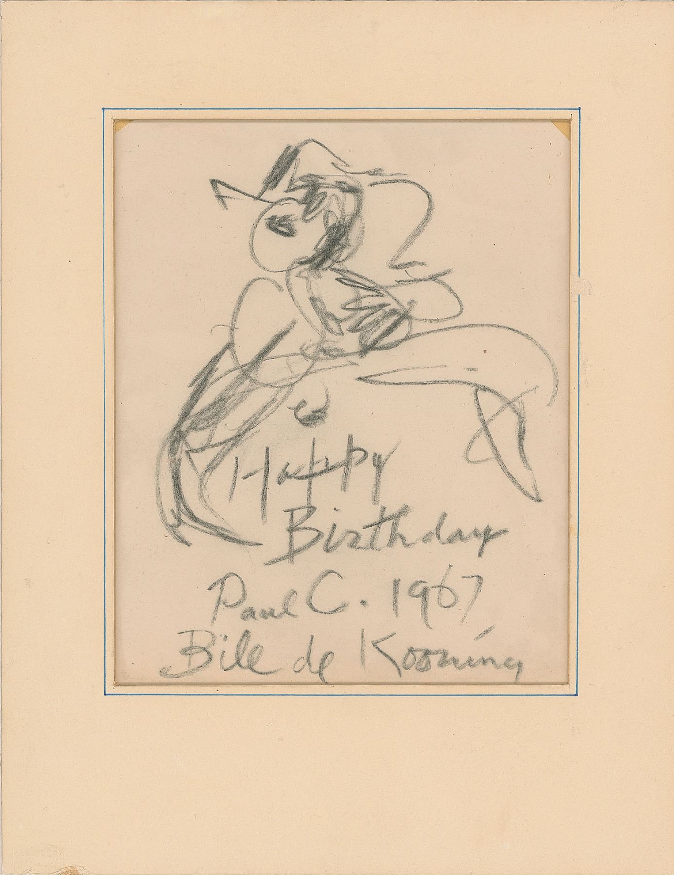 Highly desirable original abstract drawing accomplished by de Kooning in black crayon on an off-white 4.75 x 5.75 sheet, signed and inscribed below, "Happy Birthday, Paul C. 1967, Bill de Kooning." Matted to an overall size of 7 x 9. In fine condition.