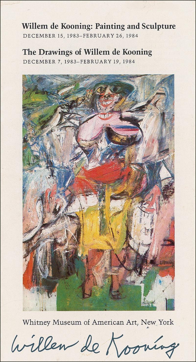 Whitney Museum of American Art brochure for a de Kooning exhibition, 5 x 9.25, signed in black felt tip, “Willem de Kooning.” In fine condition.