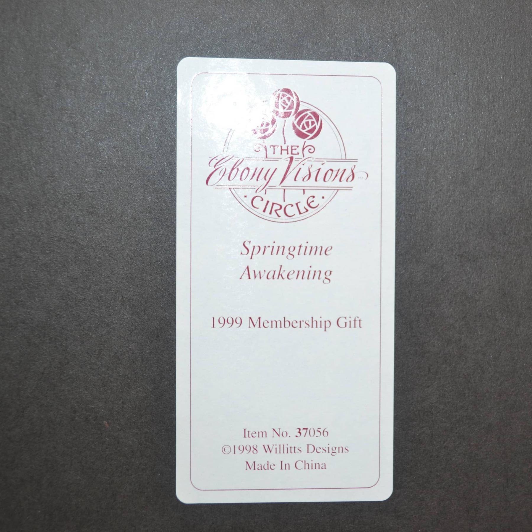Willets Designs for Ebony Visions presents the "Springtime Awakening" 1999 Membership Gift Award in Bas Relief. Exclusively for Members Only, presented and mounted, with an Emerald Green Background and a Custom Gold Tone Frame. Marks: Item No. 37056. Copyright, 1998 Willets Designs. Size: Overall Frame - 7.5"W x 8.5"H. Bas Relief: 4"W x 4.75"H.