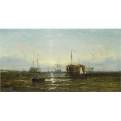William Adolphus Knell (1805 - 1875), The Fleet At Anchor, with two hulks, fishermen laying their nets, signed, dated 1878, 12in x 22in