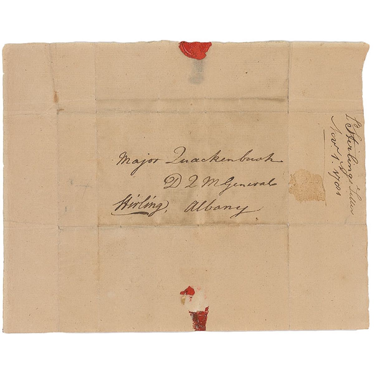 American general (1726–1783) who served during the Revolutionary War and claimed the disputed title of Earl of Stirling. Address panel, 8.25 x 6, addressed in the center in another hand to “Major Quakenbush, D. Q. M. General, Albany,” and signed in the lower left, “Stirling.” Intersecting folds, scattered toning and soiling, and red wax seal remnants to horizontal edges, otherwise fine condition.