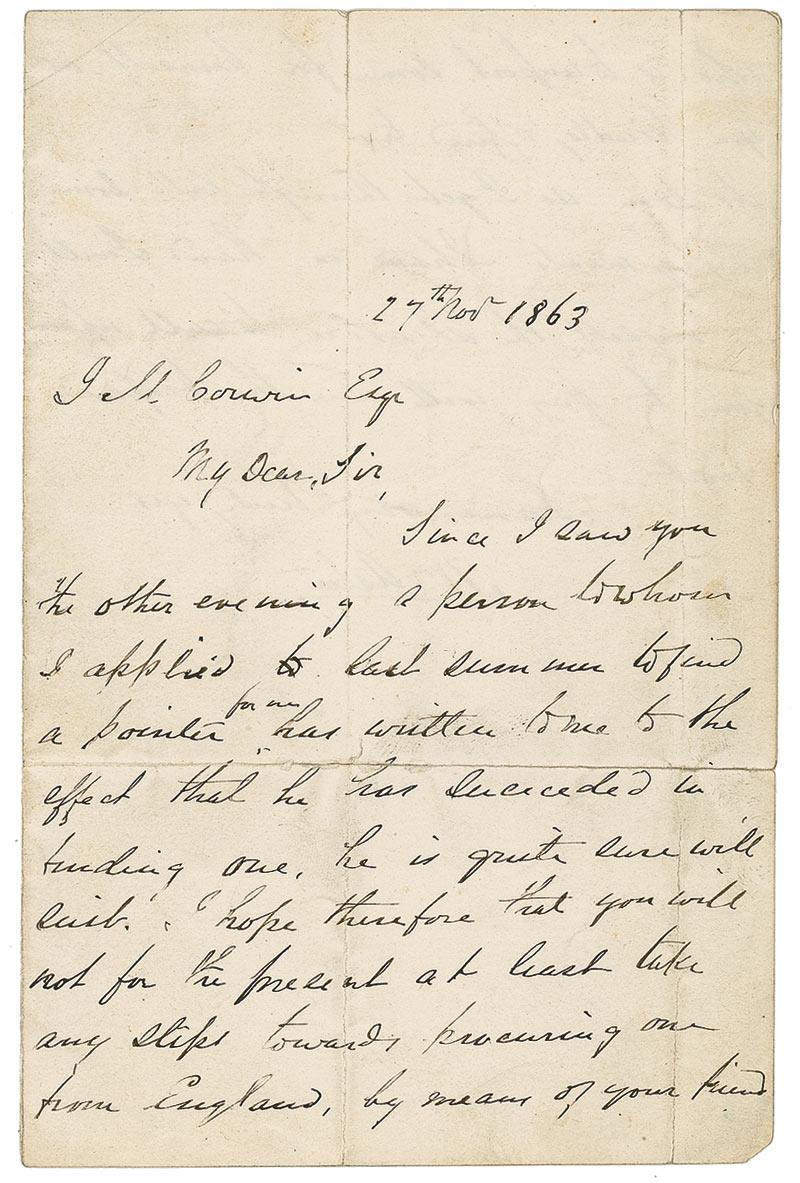 American-British financier and journalist served as New York state assemblyman and senator before moving to England and acquiring control of numerous newspapers and magazines. Rare ALS, signed “Wm. Astor,” one page both sides, 4 x 6.25, November 27, 1863. In part: “Since I saw you the other evening a person to whom I applied last summer to find a pointer for me has written me to the effect that he has succeeded in finding one…I hope therefore that you will not for the present at least take any steps towards procuring one from England.” Intersecting folds, one through a single letter of signature, tape repair along a horizontal fold, and a some scattered light toning and soiling, otherwise fine condition. Pre-certified PSA/DNA and RRAuction COA.