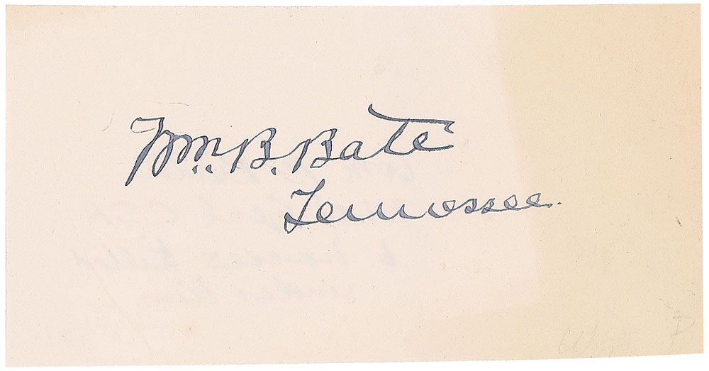 Bate served in the Confederate forces in the Civil War, attaining the rank of major general and commanding a division in the Army of Tennessee. He also served as governor of Tennessee from 1883 to 1887 and subsequently as United States senator from 1887 until his death. Ink signature, “Wm. M. Bate Tennessee,” on an off-white 5 x 2.5 sheet. In fine condition, with some mild toning to right side over the second “e” in “Tennessee.”