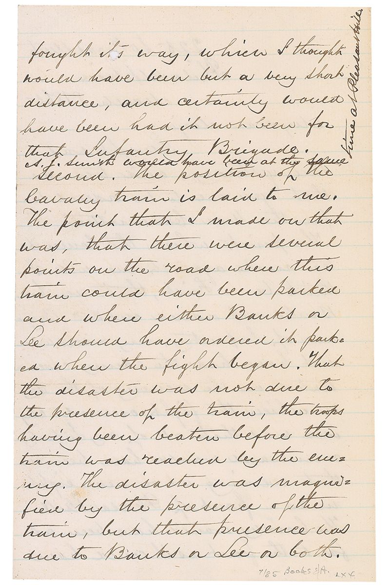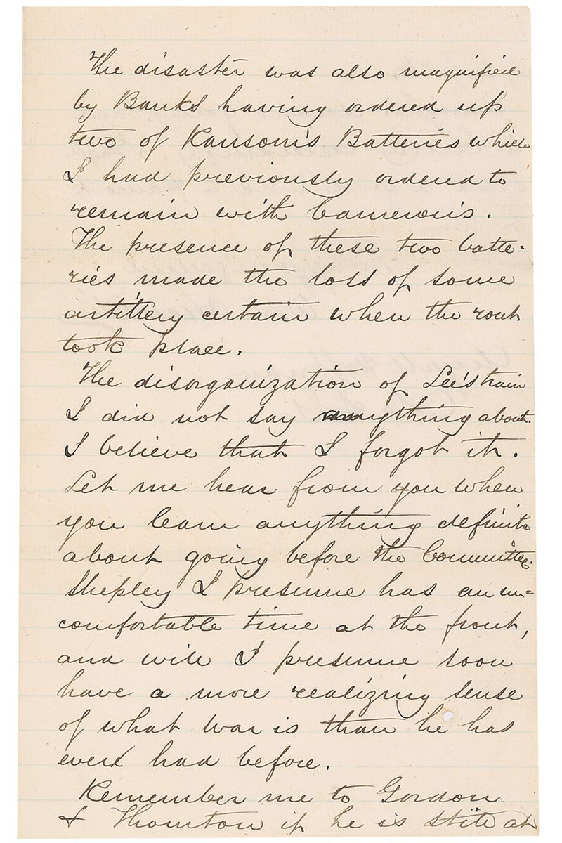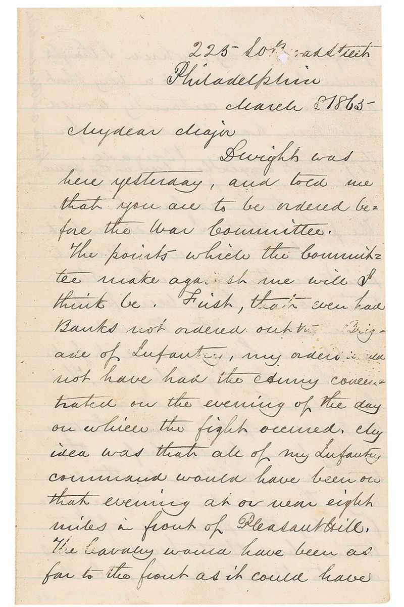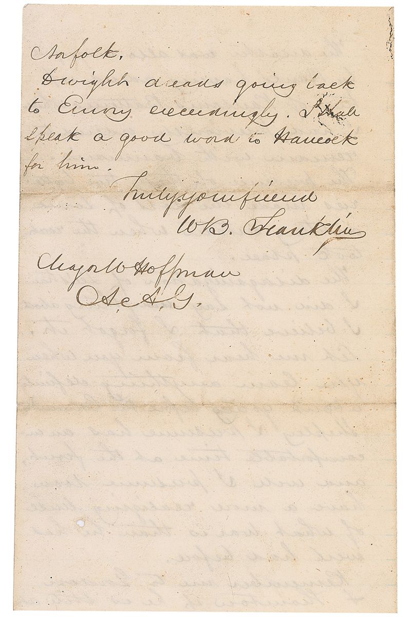 Union General (1823-1903) blamed for the Union debacle at Fredericksburg. War-dated ALS signed “W. B. Franklin,” four pages, lightly-lined on two adjoining sheets, 5 x 8, March 8, 1865. Letter to Major W. Hoffman. In part: “Dwight was here yesterday, and told me that you are to be ordered before the War Committee. The points which the Committee make against me will I think be, First, that even had Banks not ordered out the Brigade of Infantry, my orders would not have had the Army concentrated on the evening of the day on which the fight occurred…The Point that I made on that was, that there were several points on the road where this train could have been parked and where either Banks or Lee should have ordered it parked when the fight began. That the disaster was not due to the presence of the train, the troops having been beaten before the train was reached by the enemy. The disaster was magnified by the presence of the train, but that presence was due to Banks or Lee or both. The disaster was also magnified by Banks having ordered up two of Ransom's Batteries which I had previously ordered to remain with Cameron's.” Scattered light toning and soiling, otherwise fine condition.
