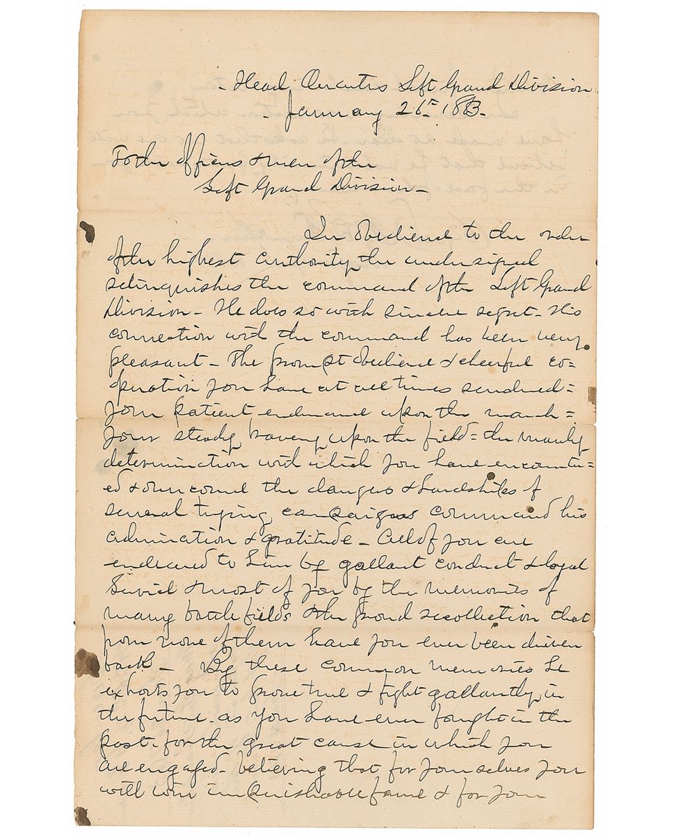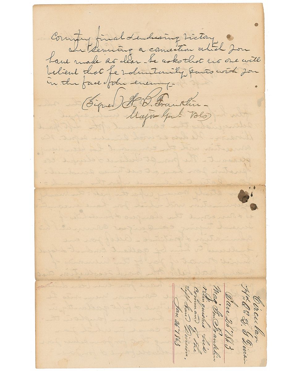 Union General (1823–1903) blamed for the debacle at Fredericksburg. Unsigned Civil War–dated manuscript ‘circular’ letter, one page both sides, 7.75 x 12.25, January 26, 1863. General Franklin’s farewell to his troops, shortly after the Battle of Fredericksburg. In part: “In obedience to the order of the highest authority the undersigned relinquishes the command of the Left Grand Division…The prompt obedience & cheerful cooperation you have at all times rendered, your patient endurance upon this march, your steady bravery upon the field, the manly determination with which you have encountered & overcome the dangers & hardships of several trying campaigns command his admiration & gratitude. All of you are endeared to him by gallant conduct & loyal service & most of you by the memories of many battlefields & the proud recollection that from none of them have you ever been driven back. By these common memories he exhorts you to prove true & fight gallantly in the future, as you have ever fought in the past, for the great cause in which you are engaged, believing that for yourselves you will win imperishable fame & for your country final & enduring victory. In severing a connection which you have made so dear he asks that no one will believe that he voluntarily parts with you in the face of the enemy.” Partial edge separation to central horizontal storage fold, and a few stray ink blotches, otherwise fine condition. Apparently the working copy or the draft dictated by General Franklin that was to be used as the substance for the official printed ‘Farewell Address’ distributed to his troops. While Franklin was blamed for the defeat at Fredericksburg, he claimed it was due to poor orders from Ambrose E. Burnside and launched a political offensive against the general, undermining his leadership. Burnside, in turn, retaliated by campaigning to have Franklin removed from the Army all together—instead, Franklin was relieved of command of the Left Grand Division and reassigned to a corps command in Louisiana, thus this letter of resignation. A most uncommon and historic Civil War item.