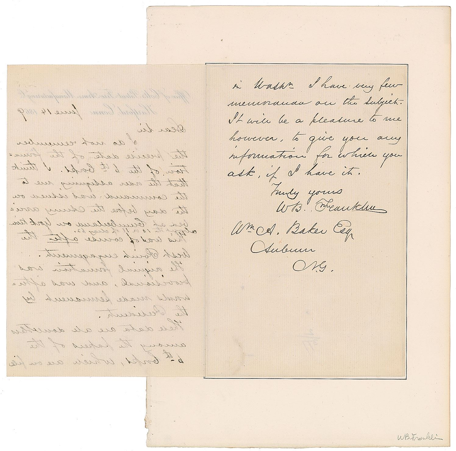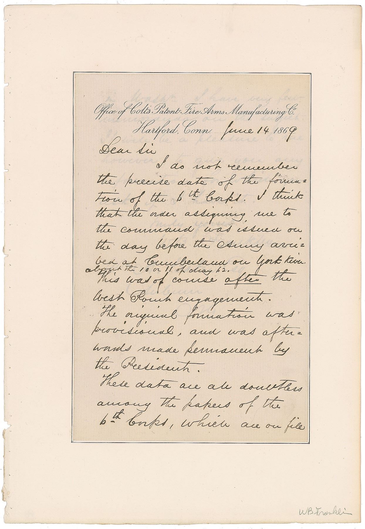 United States Army officer (1823–1903) and a Union Army general in the American Civil War who was blamed for the debacle at Fredericksburg. ALS signed “W. B. Franklin,” two pages on two adjoining sheets, 5 x 8, Office of Colt's Patent Fire Arms Manufacturing Co. letterhead, June 14, 1869. Letter to William A. Baker of Auburn, New York, in full: "I do not remember the precise date of the formation of the 6th Corps. I think that the order assigning me to the command was issued on the day before the Army arrived at Cumberland on York River about the 10 or 11 of May 62. This was of course after the West Point engagement. The original formation was provisional, and was afterwards made permanent by the President. These data are all doubtless among the papers of the 6th Corps, which are on file in Wash'n. I have very few memoranda on the subject. It will be a pleasure to me however, to give you any information for which you ask, if I have it." Professionally inlaid into a slightly larger sheet. In fine condition. Accompanied by an engraving bearing a preprinted signature.