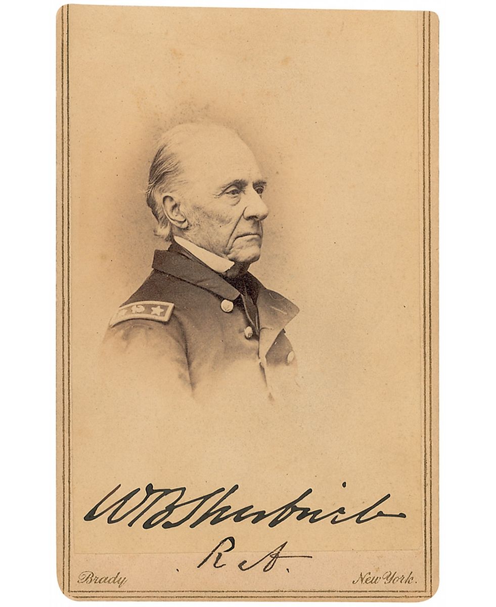 US naval officer (1790–1874) who served in the War of 1812 and the Mexican-American War. Original 2.25 x 3.5 carte-de-visite photo by Brady’s of New York, signed below the image in black ink, “W. B. Shubrick, R. A.” In very good condition, with trimmed top edge, and some trivial spotting to background of image.