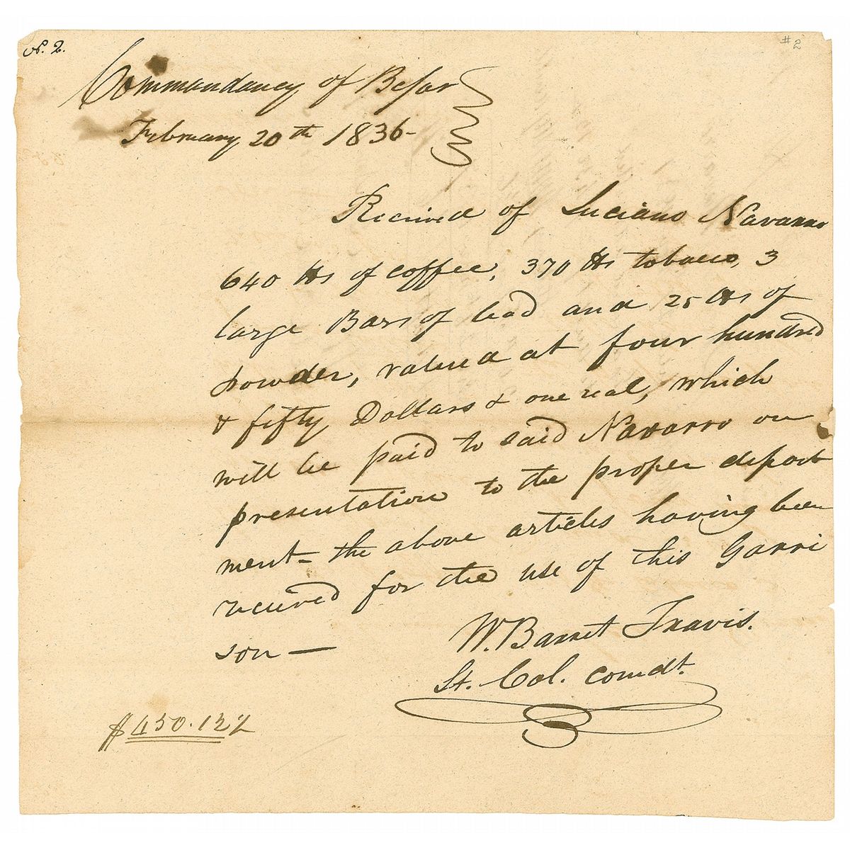 Important ADS written just three days before the beginning of the Battle of the Alamo, signed “W. Barret Travis, Lt. Col. Comdt.,” one page, 8 x 7.5, February 20, 1836. Headed at the top “Commandancy of Bexar,” the document reads, in full: “Received of Luciano Navarro 640 lbs of coffee; 370 lbs tobacco, 3 large Bars of lead and 25 lbs of powder, valued at four hundred & fifty Dollars & one real, which will be paid to said Navarro on presentation to the proper department the above articles having been received for the use of this Garrison.” Docketing on reverse reads, “5323 $450.13, Luciano Navarro, filed 27th Nov. 1837, Examined admitted to audit for $450.122,” signed by the auditor. Docketing continues “20th February 1836, In. 28th Nov 1837, No. Draft 6446 W.,” and “approved 29 Nov 1837, E. M. Pease Controller.” A smaller docket, in Spanish, incorporates the words, “General de Texas.” Intersecting folds, mild toning, mainly along folds, light show-through from endorsements on reverse, and a few stray spots, otherwise fine condition.