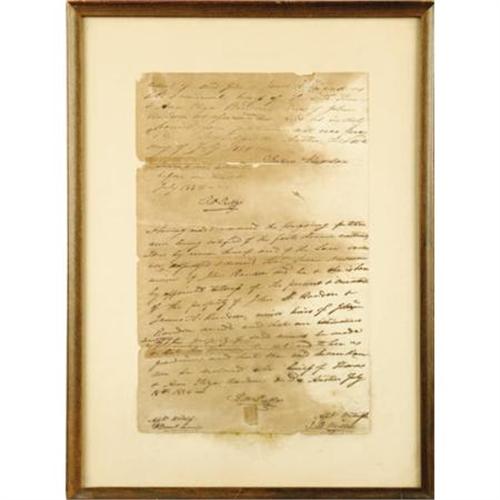 <B>William Barret Travis Signed Document </B></I> One page, 8" x 12.5", Austin, July 18, 1834, signing as witness on a legal document appointing Susan Newman "<I>tutoress of the persons and curatorship of the property of John N. Randon & James A. Randon, minor heirs of John N. Randon, decsd </B></I>[deceased]". Document is penned beneath a similar assignation dated three days earlier. Unexamined out of frame, there are cello tape stains bleeding from verso, uneven toning and separations at folds some with paper loss. Condition rates just good, and is estimated accordingly.<BR><BR><b>Shipping:</b> Framed - with Glass, Small (<a target="_blank" href="http://www.heritageauctions.com/common/shipping.php">view shipping information</a>)