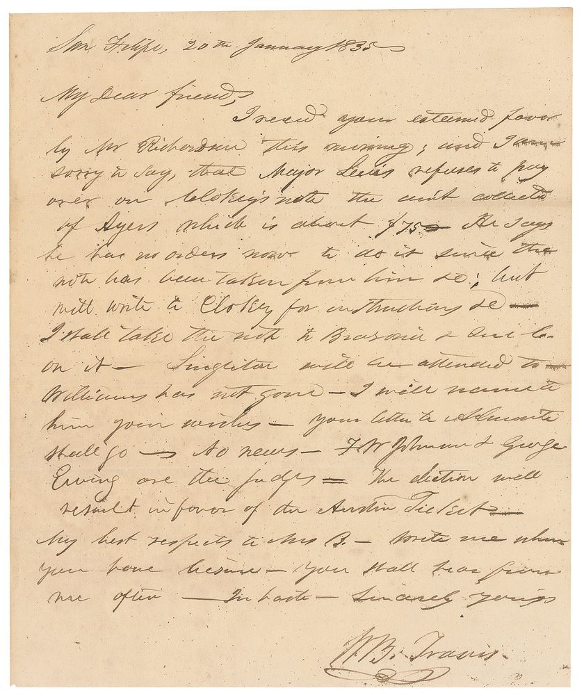 Lawyer and soldier (1809–1836). He grew up in South Carolina and Alabama, studied law privately, and was admitted to the bar before he turned 20. Migrating to Texas in the early 1830s, he became active in the movement agitating for independence from Mexico. In 1835 he led a small band of Texans in open revolt; in early 1836 Mexican forces besieged his little command inside the Alamo fortress. The Alamo fell on March 6, 1836, and all its defenders, including Travis, were killed. Extremely rare ALS signed “W. B. Travis,” one page, 7.75 x 9.25, January 20, 1835. A letter to future interim president of the Republic of Texas, David G. Burnet, who was serving as an appointed judge in San Felipe de Austin. Travis writes, in full: “I rec’d your esteemed favor by Mr. Richardson this morning; and I am sorry to say, that Major Luis refuses to pay over on Clokey’s note the am’t collected of Ayers which is about $750. He says he has no orders now to it since the note has been taken from him & c; but will write to Clokey for anything & c—I shall take the note to Brasoria & decide on it—Litigation will be [?] attended to—Williams has not gone—I will name him to your wishes—your letter to Aduconte shall go—So news—F. W. Johnson & George Ewing are the judges—The election will result in favor of an Austin Ticket—my best respects to Mrs. B.—write me when you have leisure—you shall hear from me often—In haste—sincerely yours.” Second integral page bears an address panel in an unknown hand to Burnet in San Jacinto, Texas. In fine condition, with intersecting folds (several extra horizontal folds) and one faint vertical fold passing through a single letter of signature.
