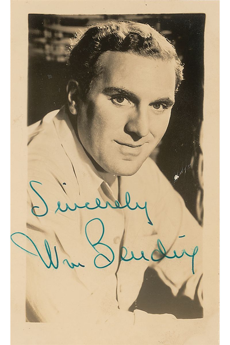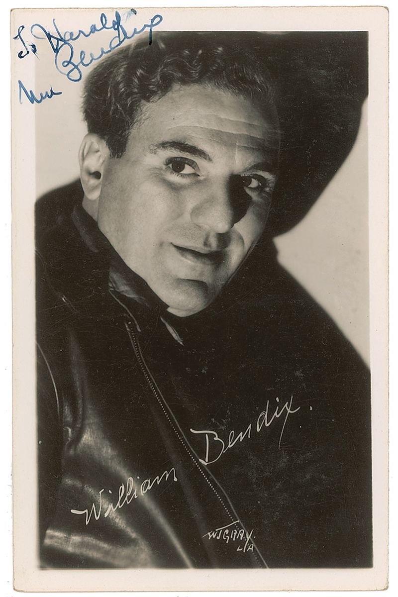 Two photos: vintage glossy 3.5 x 5.5 real photo postcard, signed and inscribed in fountain pen, “To Harold, Wm. Bendix”; and a vintage glossy 2.5 x 4 head-and-shoulders photo, nicely signed in fountain pen, “Sincerely, Wm. Bendix.” Some scattered surface spotting, and a light crease to the smaller photo, otherwise overall fine condition.