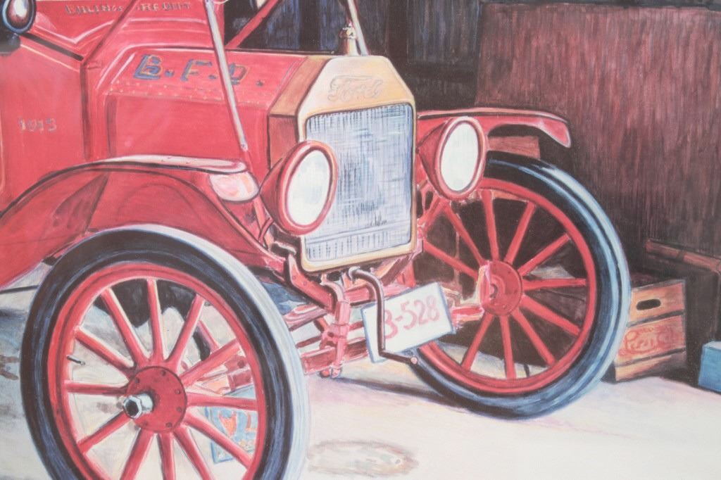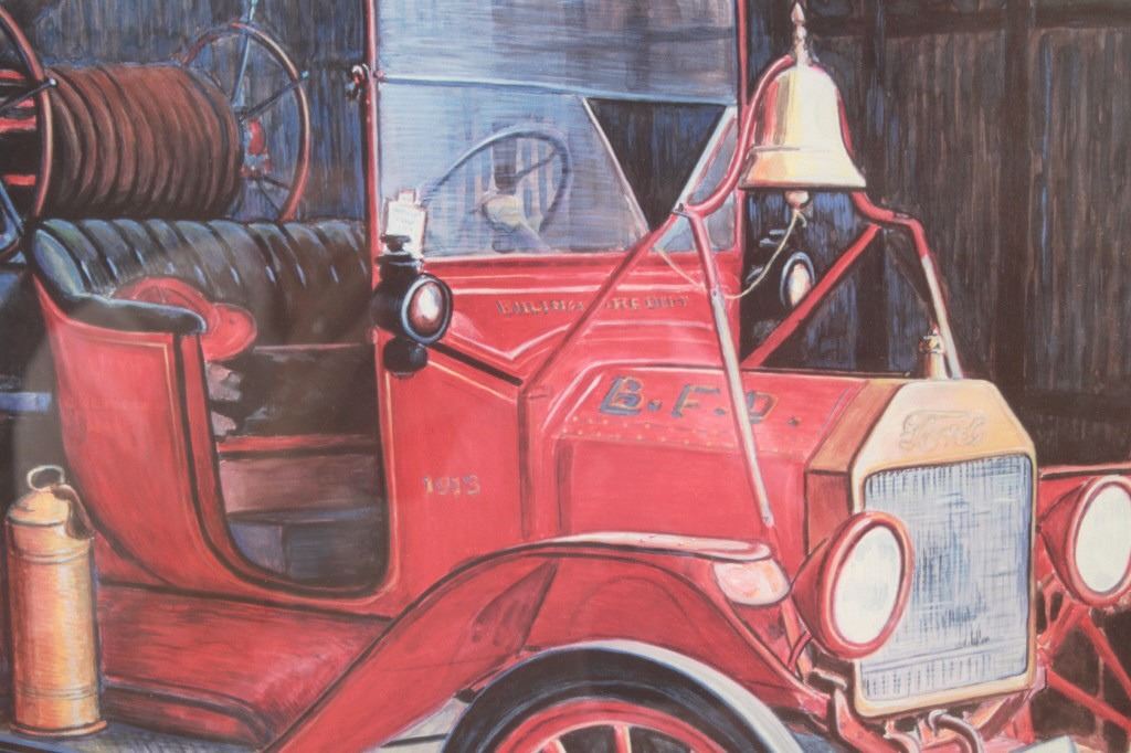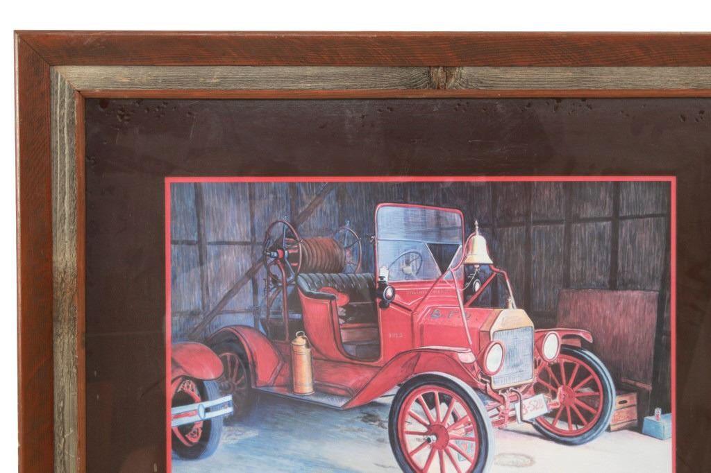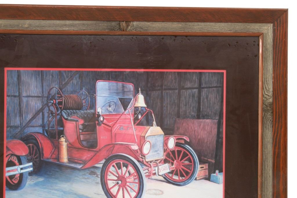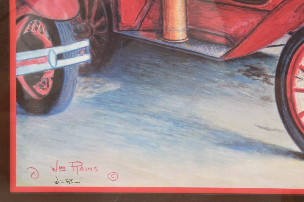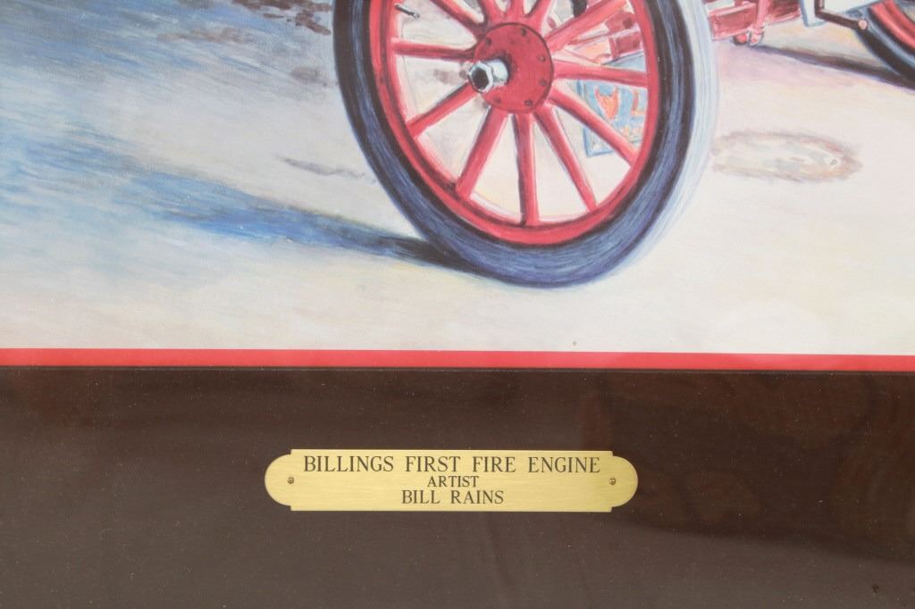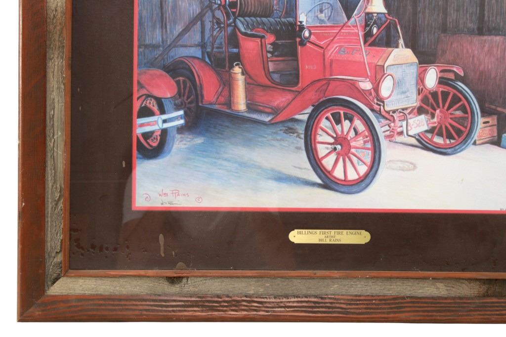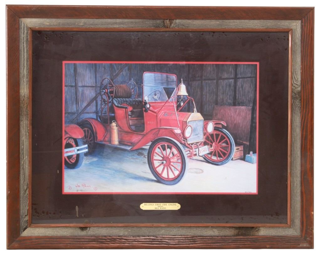 Featured in this lot is this limited edition print, originally done by Billings, Montana artist William (Bill) Rains, titled, "Billings First Fire Engine" 1980-90s. Clyde and Della Rains gave birth to Bill on November 3, 1936, in Forsyth, Montana. He married Melissa Ann Berryhill on January 5, 1956, in San Francisco, California, after meeting her while serving in the United States Navy. Bill and Melissa relocated to Billings, Montana, in 1969. As a professional artist, Bill spent his life painting and sculpting the people, culture, landscapes, and wildlife of Montana and the American West. Bill's influences were Montana artist Charlie Russell and Dutch painter Vincent Van Gogh. Bill's art was collected by collectors around the United States. Bill's most renowned accomplishments are his life-size sculptures of country music's biggest stars, including Elvis Presley, Garth Brooks, Johnny Cash, Buck Owens, and Hank Williams. This limited edition print is numbered 24 out of 300 and shows Billings Fire Departments first fire engine. The fire engine is marked on the side reading, "B.F.D." while the front is marked reading, "Billings Fire Dept.". It is marked on the left hand corner reading, "Wm Rains ©", while the right hand corner is marked, "24/300". On the matting paper is a brass plaque reading, "Billings First Fire Engine / Artist / Bill Rain". It is matted once with black matting paper and set in a large wood frame. It is set behind glass to preserve its condition. The print shows good condition overall with no wear or damage present. The matting paper and the wood frame show wear present from its age and use over the years, but no major signs of damage is noted. The visible art measures 14 5/8" L x 21 5/8 " W, while the entire piece measures 26 3/4" L x 33 7/8" W x 2" D. It has a weight of 11 pounds and 8 ounces.