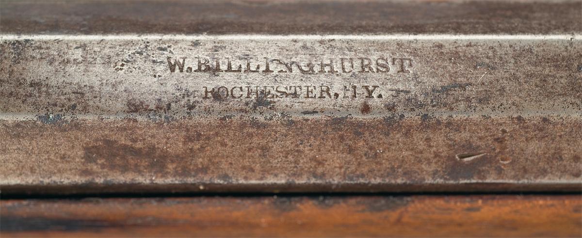 Working with Miller's patent system, Billinghurst operated out of Rochester, New York making pill-lock and percussion arms, many of the former being converted when the pill method fell out of use. Blade front and notch rear sights, with "W.BILLINGHURST/ ROCHESTER, N.Y." on the top flat behind the rear sight. Manually rotated 7-round cylinder, with the spring loaded catch mounted on the forearm and percussion nipples screwed into the pill holes. Smooth straight grip stock, with a wood ramrod, brass panel on the rear of the forearm, a pierced-through floral engraved plate on the right side of the buttstock and a smooth brass buttplate.