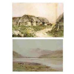 William Bingham McGuinness RHA (1849-1928) THATCHED COTTAGES WITH CATTLE and A GREY DAY, BALLA...
