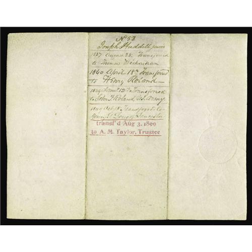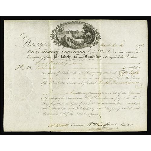 <B>Philadelphia and Lancaster Turnpike. 1 Share.</B></I><BR>William Bingham (1752-1804), Banker, Legislator. Founder and director of the Bank of North America, the first bank in the country (1781). Served in the Continental Congress (1786-89), and in the U.S. Senate (1795-1801). He signs this early Philadelphia and Lancaster Turnpike stock in 1795 as its first President. This is America's first turnpike. Printed on sheepskin and in superb condition. It has the most charming vignette of a Conestoga covered wagon about to pass through a tollgate. These stocks were found in the 1970's in New York City and are becoming quite scarce in this choice condition. Includes a nice portrait of Bingham. Typical stock tri-fold. <B>Extremely Fine.</B></I>