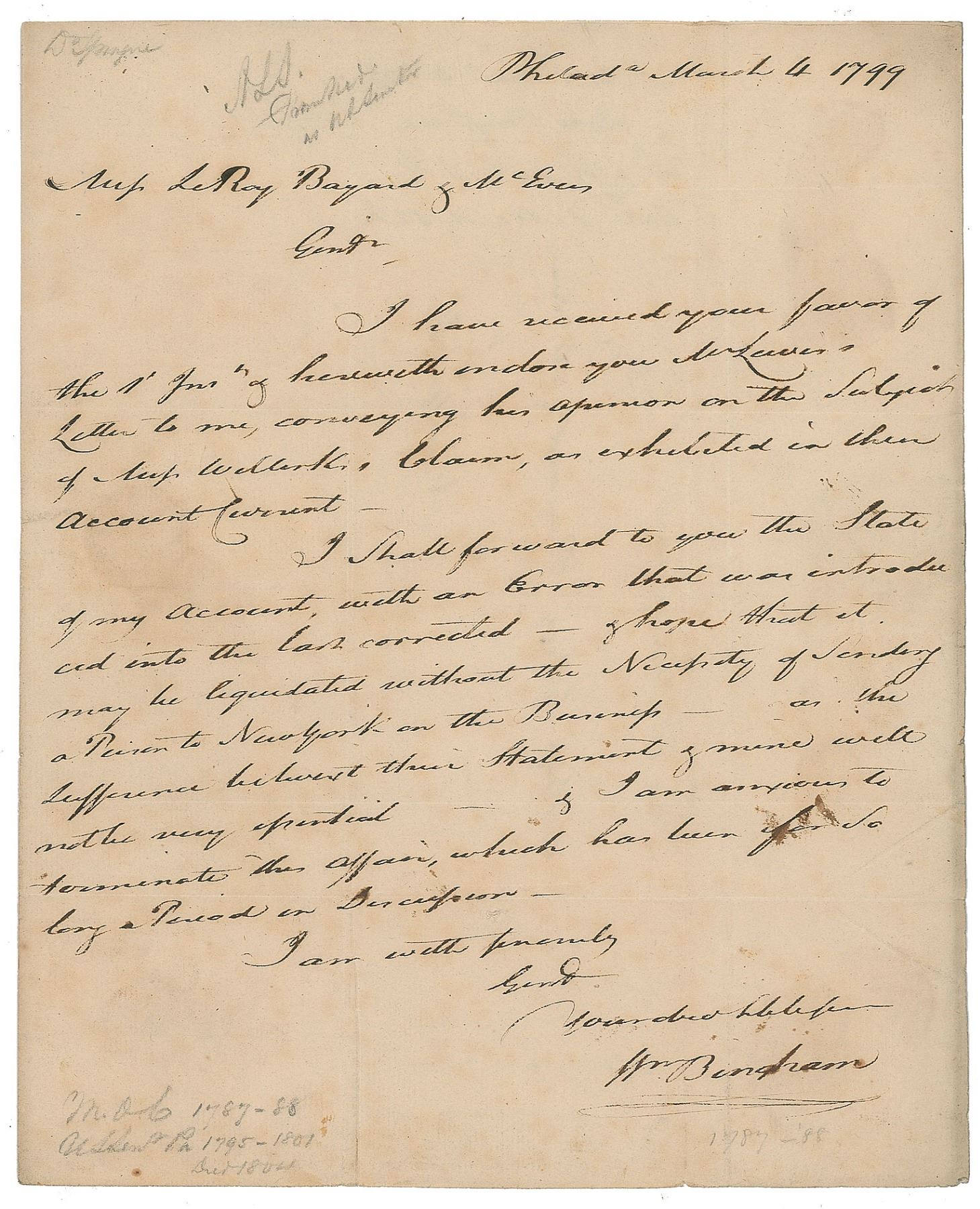 ALS signed “Wm. Bingham,” one page, 7.75 x 9.75, March 4, 1799. Letter to Messrs. LeRoy, Bayard & McEver, in part: "I shall forward to you the state of my account, with an error that was introduced into the last corrected—& hope that it may be liquidated without the necessity of sending a person to New York on the Business." Addressed on the integral leaf in Bingham's hand, and free franked across the top, "Free, Wm. Bingham." In very good to fine condition, with light soiling, intersecting folds, and staining to the integral address leaf from old adhesive residue.
