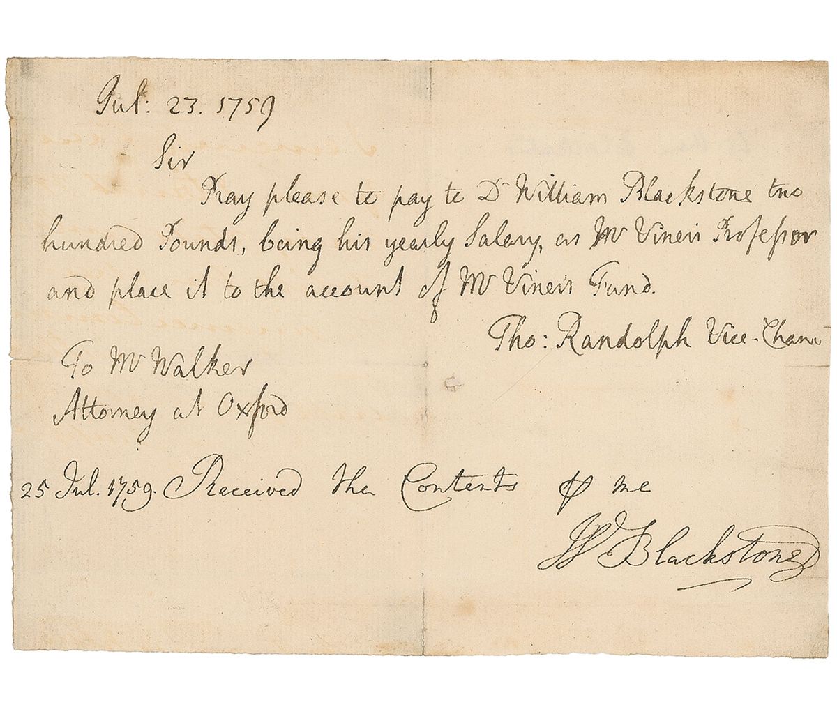 English jurist, judge, and Tory politician (1723–1780) known for writing Commentaries on the Laws of England; he was confirmed as the first Vinerian Professor of English Law in October 1758. Handwritten endorsement, signed “W. Blackstone,” at the conclusion of a pay order written to him by Thomas Randolph, one page, 7 x 5, July 23, 1759. The order, in part: “Pray please to pay to Dr William Blackstone two hundred Pounds, being his yearly salary, as…Vinerian Professor.” Endorsed at the conclusion by Blackstone to confirm receipt: “25 Jul. 1759. Received the Contents.” Intersecting folds and some scattered foxing, otherwise fine condition.