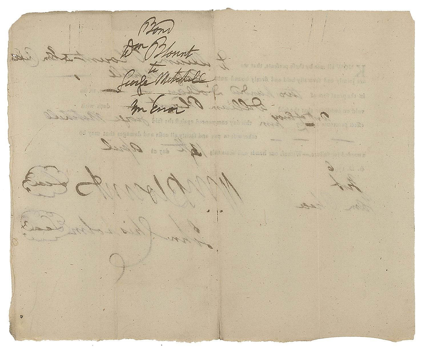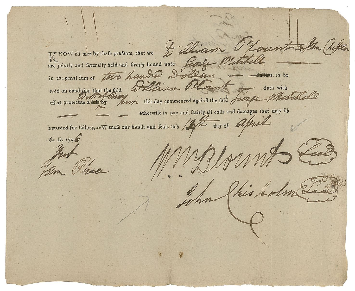 Partly-printed DS, signed “Wm. Blount,” one page, 8 x 6.75, April 14, 1796. In part: "Know all men by these presents, that we William Blount & John Chisholm are jointly and severally held and firmly bound unto George Mitchell in the penal sum of two hundred dollars—, to be void on condition that the said William Blount—doth with effect prosecute a write of error by him this day commenced against the said George Mitchell—otherwise to pay and satisfy all costs and damages that may be awarded for failure." Signed at the conclusion by both Blount and Chisholm. In very good to fine condition, with rusty paperclip impressions to the top edge.