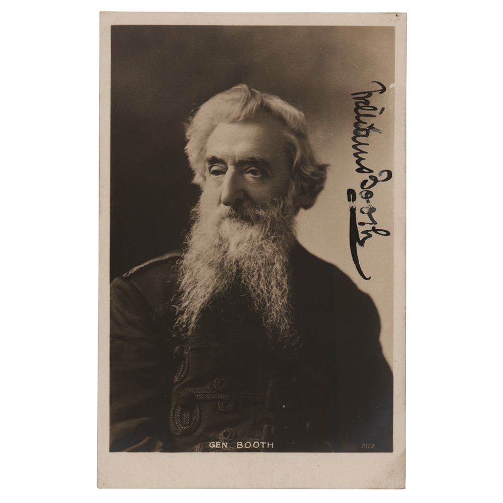 British minister and social reformer (1829-1912) best known as the founder and first 'General' of the Salvation Army. Vintage matte-finish 3.5 x 5.5 postcard photo of General William Booth in his Salvation Army uniform, signed vertically in bold fountain pen. In very fine condition.