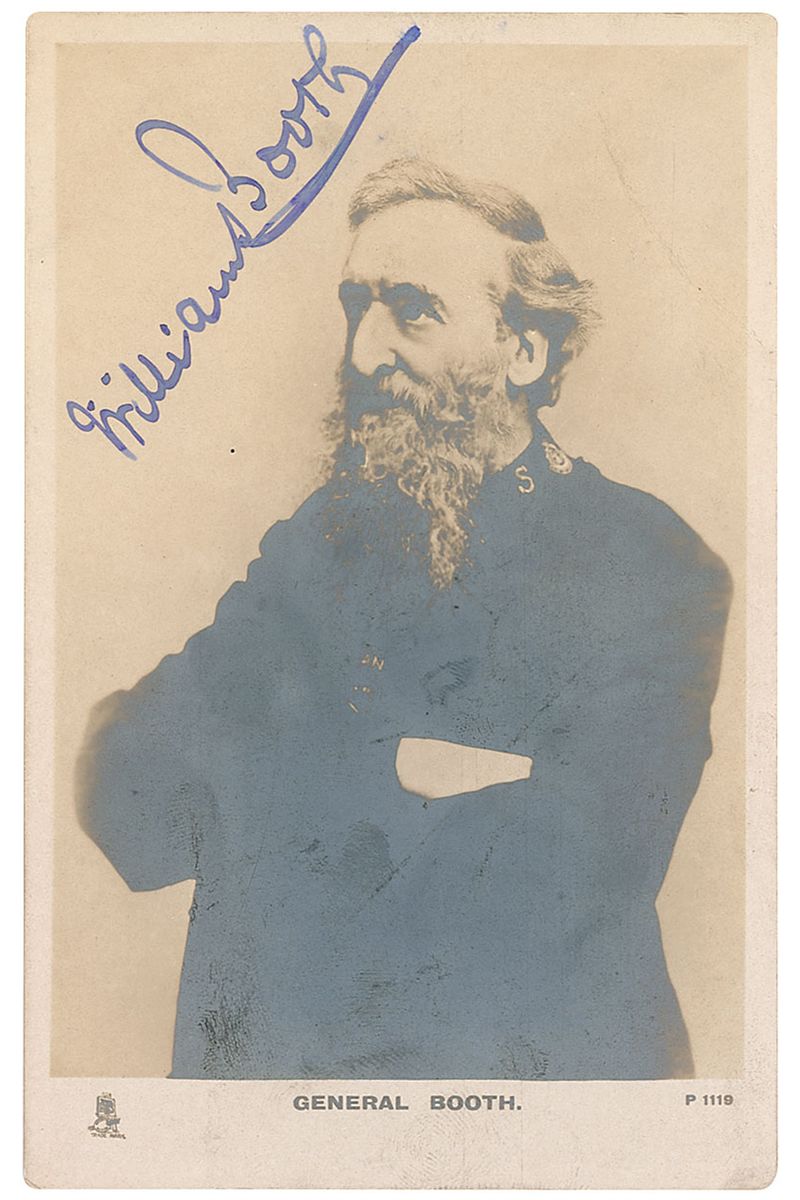 British minister and social reformer (1829–1912) best known as the founder and first ‘General’ of the Salvation Army. Vintage 3.5 x 5.5 real photo postcard of Booth with his arms crossed, boldly signed in fountain pen. In very good condition, with a few light creases and moderate silvering to dark areas of the image.