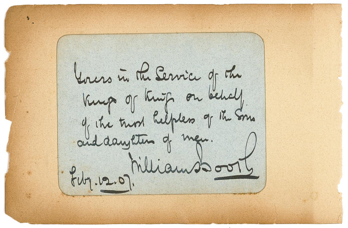 British minister and social reformer (1829–1912) best known as the founder and first “General” of the Salvation Army. Fountain pen signature, “Yours in the service of the King of Kings on behalf of the tried[?] helpless of the Sons and daughters of men. William Booth, Feby.12.07.,” on a light blue 4.5 x 3.5 card. Card is affixed to a 7.25 x 5 toned off-white album page, with another card affixed to reverse. In fine condition, with some mild toning along bottom edge of card.