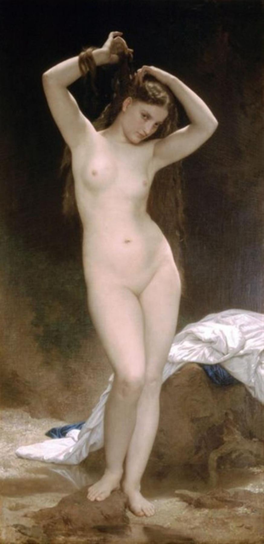 Artist: William Bouguereau Title: Bather Medium: Fine Art Reproduction Giclee on Canvas Image Size: Approximately 32 inches x 15.5 inches Unframed on Unstretched Canvas Biography: "William Bouguereau is unquestionably one of history's greatest artistic geniuses. Since 1960, his values in the market place have literally exploded, doubling on average every 3.5 years. From works selling for and average $500 to $1500 in 1960, they have accelerated to where in the last three years alone his auction records have been repeatedly broken another 4 times. In 1998 The Heart's Awakening sold for $1,410,000 at Christie's New York. In 1999 Cupid et Psyche, Enfants sold for $1,760,000 also at Christie's to be surpassed the very next day at Sotheby's when Alma Perens owned by Sylvester Stalone sold for $2,650,00. That record only lasted one year until May of 2000, when Charite sold $3,520,000 back at Christie's. Over the last 20 years his paintings all over the world have been taken out of their crates, basements, storage rooms and attics, dusted off, many cleaned and expertly restored, and today over a hundred museums and institutions proudly have his works on permanent exhibit.