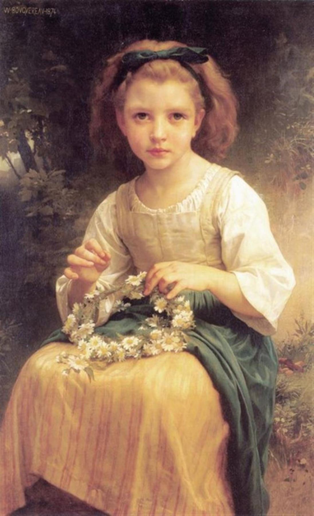Artist:  William Bouguereau Title: Child Braiding A Crown Medium: Fine Art Reproduction Giclee on Canvas Image Size: Approximately 32 inches x 19.5 inches   Unframed on Unstretched Canvas Biography: "William Bouguereau is unquestionably one of history's greatest artistic geniuses. Since 1960, his values in the market place have literally exploded, doubling on average every 3.5 years. From works selling for and average $500 to $1500 in 1960, they have accelerated to where in the last three years alone his auction records have been repeatedly broken another 4 times. In 1998 The Heart's Awakening sold for $1,410,000 at Christie's New York.  In 1999 Cupid et Psyche, Enfants sold for $1,760,000 also at Christie's to be surpassed the very next day at Sotheby's when Alma Perens owned by Sylvester Stalone sold for $2,650,00. That record only lasted one year until May of 2000, when Charite sold $3,520,000 back at Christie's. Over the last 20 years his paintings all over the world have been taken out of their crates, basements, storage rooms and attics, dusted off, many cleaned and expertly restored, and today over a hundred museums and institutions proudly have his works on permanent exhibit.