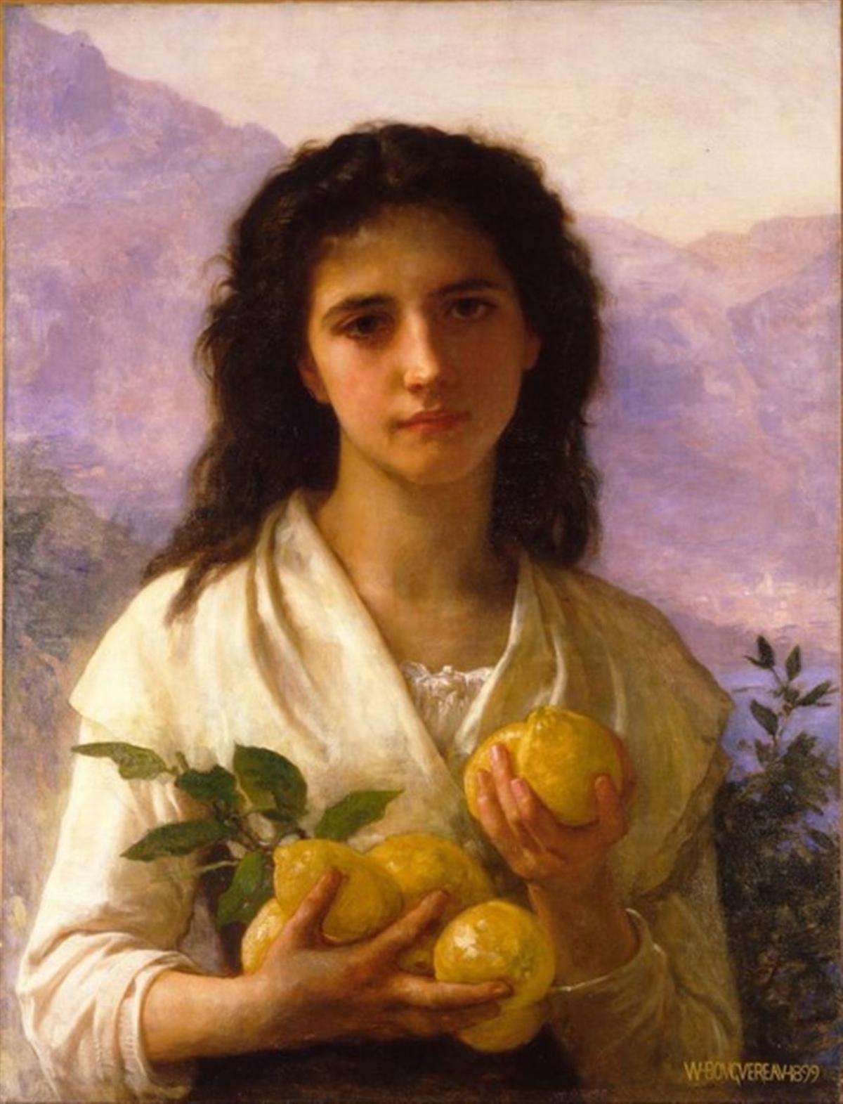 Artist: William Bouguereau - Title: Girl Holding Lemons - Medium: Fine Art Reproduction Giclee on Canvas - Image Size: Approximately 32 inches x 24.5 inches - Unframed on Unstretched Canvas - Biography: William Bouguereau is unquestionably one of history's greatest artistic geniuses. Since 1960, his values in the market place have literally exploded, doubling on average every 3.5 years. From works selling for and average $500 to $1500 in 1960, they have accelerated to where in the last three years alone his auction records have been repeatedly broken another 4 times. In 1998 The Heart's Awakening sold for $1,410,000 at Christie's New York.