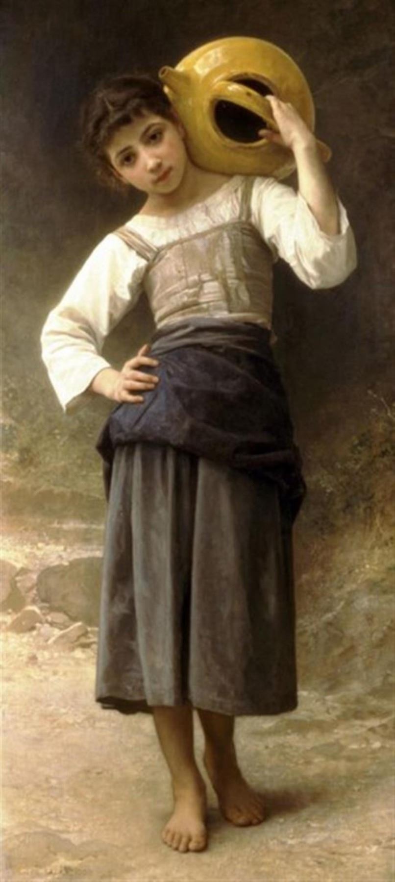 Artist: William Bouguereau Title: Young Girl Going to the Spring Medium: Fine Art Reproduction Giclee on Canvas Image Size: Approximately 20 inches x 9 inches Unframed on Unstretched Canvas Biography: "William Bouguereau is unquestionably one of history's greatest artistic geniuses. Since 1960, his values in the market place have literally exploded, doubling on average every 3.5 years. From works selling for and average $500 to $1500 in 1960, they have accelerated to where in the last three years alone his auction records have been repeatedly broken another 4 times. In 1998 The Heart's Awakening sold for $1,410,000 at Christie's New York. In 1999 Cupid et Psyche, Enfants sold for $1,760,000 also at Christie's to be surpassed the very next day at Sotheby's when Alma Perens owned by Sylvester Stalone sold for $2,650,00. That record only lasted one year until May of 2000, when Charite sold $3,520,000 back at Christie's. Over the last 20 years his paintings all over the world have been taken out of their crates, basements, storage rooms and attics, dusted off, many cleaned and expertly restored, and today over a hundred museums and institutions proudly have his works on permanent exhibit.