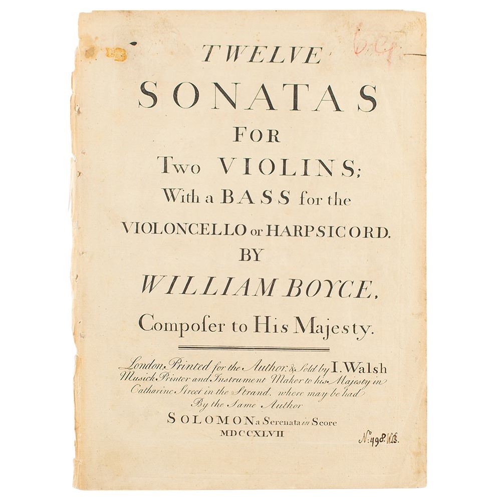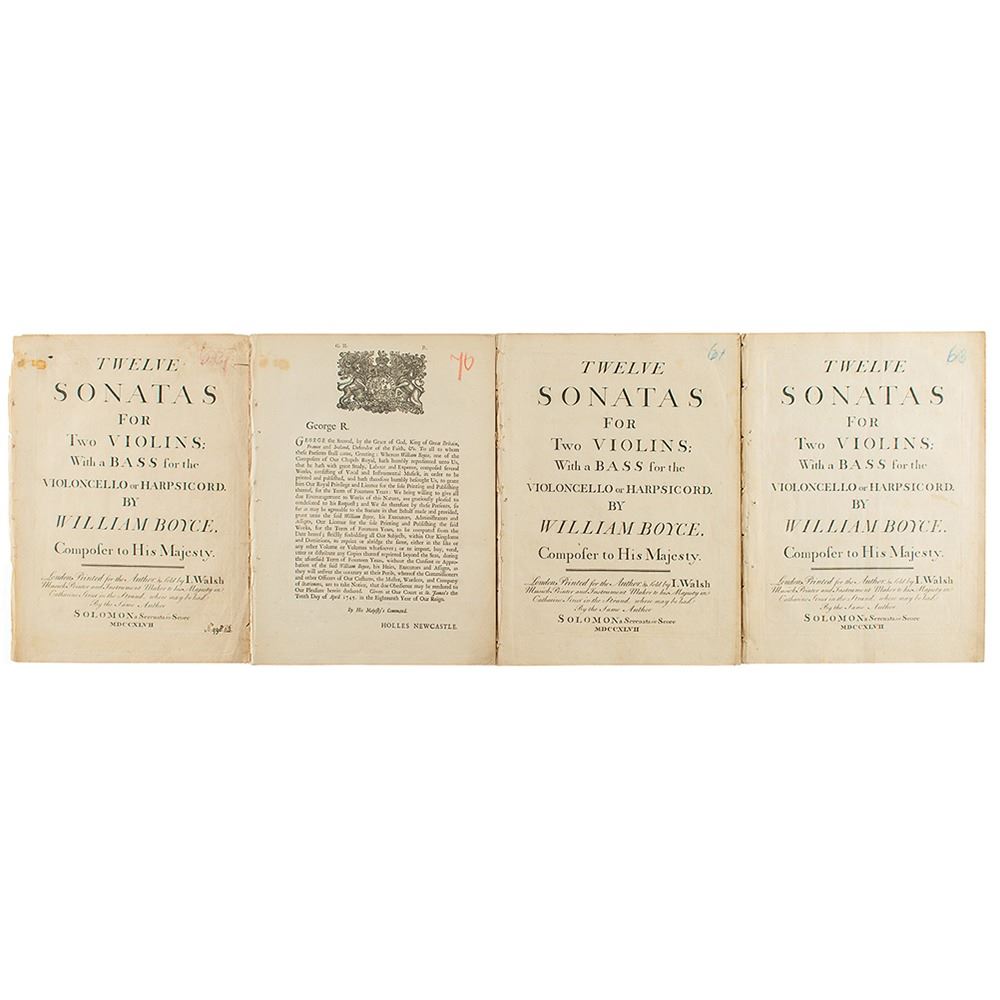 Sheet music entitled "Twelve Sonatas for Two Violins; With a Bass for the Violoncello or Harpsicord," printed in London in 1747, signed on the detached title page in ink by Boyce with his initials, "W.B." The title page is also numbered in ink, "No. 498." Includes the disbound sheet music booklets for the three parts: "Violino Primo," "Violino Secondo," and "Basso e Violoncello." In the front of the first violin section is a printed order by King George grating copyright to Boyce, and a list of subscribers. In very good to fine condition, with soiling and staining. Boyce's autograph is exceedingly scarce; this sheet music is one of the only formats in which it is obtainable.