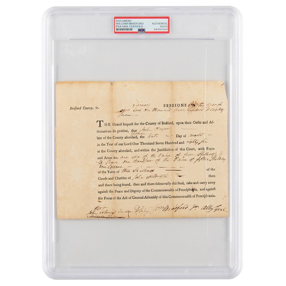 Partly-printed DS, signed “W. Bradford, Jr., Atty Genl.,†one page, 8.25 x 6.5, January 1787. Grand inquest document from the County of Bedford, finding that John Hagar “then and there feloniously did steal, take and carry away against the Peace and Dignity of the Commonwealth of Pennsylvania,†from John Hillbright an ax, hand saw, and square. Signed at the conclusion by William Bradford. In very good to fine condition, with scattered light stains, and toning along the folds. Encapsulated in a PSA/DNA authentication holder.