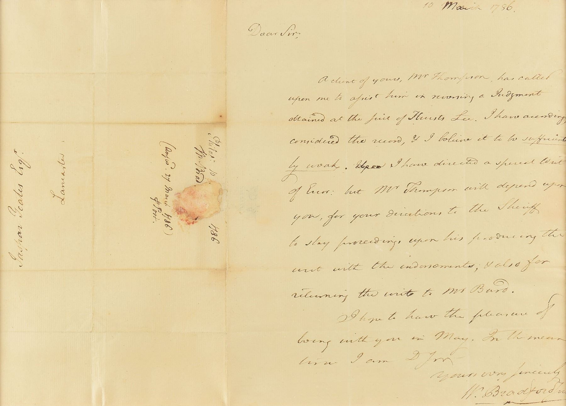 ALS signed “W. Bradford, Jr.,” one page, measures 12.25 x 8.75 unfolded, March 10, 1786. Letter to Jaspar Yeats, in part: "A Client of yours, Mr. Thompson, has called upon me to assist him in recovering a Judgment obtained at the suit of Hursts Lee. I have accordingly considered the record…I have directed a special writ of Error: but Mr. Thompson will depend upon you, for your directions to the Sheriff to stay proceeding, upon his producing the writ with the indorsements; & also for returning the writ to Mr. Bard." Double-matted and framed to an overall size of 18 x 14.75. In fine condition.