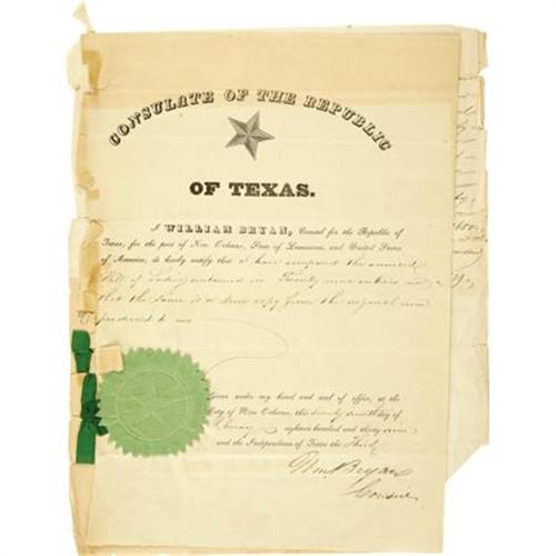 <B>William Bryan Partially Printed Document Signed</B></I> as Consul to New Orleans, total of 3 pp.,Feb. 27, 1839. In part: "<I>I William Bryan, Consul for the Republic of Texas, for the Port of New Orleans...do hereby certify that I have compared the annexed Bill of Lading contained in Twenty nine entries, and that the same is a true copy from the original now produced to me...</B></I>" With embossed green seal and attached to the aforementioned bill of lading for the schooner <I>Sparticus</B></I> dated May 15, 1835, and an additional manuscript document signed by Bryan and Charles Dawn, in which Dawn certifies that the Bill of Lading is also a true copy. Furthermore that: "<I>we, the above mentioned firm, procured the Insurance on said goods and by said vessel, to the amount of $9650</B></I>..."<BR><BR>William Bryan was an important financial backer of the Texas Revolution and Republic. He worked tirelessly to raise money and helped negotiate financial and legal difficulties for Texas. Bryan was also instrumental in the establishment of the Texas Navy. He was appointed consul to New Orleans by Lamar. Despite the pivotal role he played in the Revolution and Republic eras, Bryan was never repaid adequately for the financial and other services he rendered to the Republic. With chipping along margins and light toning, otherwise very good condition.<BR><BR><b>Shipping:</b> Flat Material, Small (<a target="_blank" href="http://www.heritageauctions.com/common/shipping.php">view shipping information</a>)