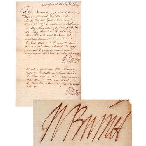 <Our item number 140852><B>Burnet, William - Colonial Governor of New York, New Jersey, Massachusetts and New Hampshire.</B> Document Signed twice as Governor of New York, 12¼ x 7½ in., New York, 28 April 1724. Burnet's first signature, measuring 2½ by 1in., attests that three men witnessed John Theobald, deceased, sign his Last Will and Testament; the second signature, only slightly smaller, certifies that the Executors named in said Will have taken the Oath of Administration. Fine; tipped into a slightly larger sheet; some tiny pinpricks at top. <BR>Estimated Value $400 - 600. <BR><BR>Our item number 140852<BR><IMAGES><P ALIGN="CENTER"><IMG SRC="http://www.goldbergcoins.net/liveauction/49jpegs/140852.jpg"> </P></IMAGES>