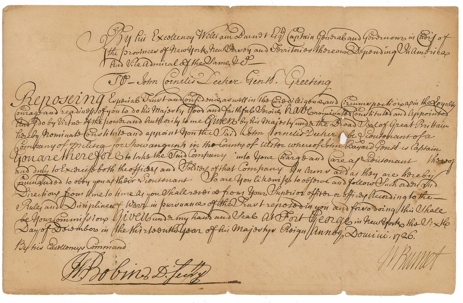 British civil servant and colonial administrator (1688-1729) who served as governor of New York and New Jersey. Manuscript DS, signed “W. Burnet,” one page, 12.5 x 8, December 6, 1726. Burnet commissions John Cornelius Decker, lieutenant of a company of militia in Ulster County [New York]. Three vertical folds, with a small area of paper loss to one fold, scattered edge wear, light overall toning, and some light mirroring of ink, otherwise very good condition.
